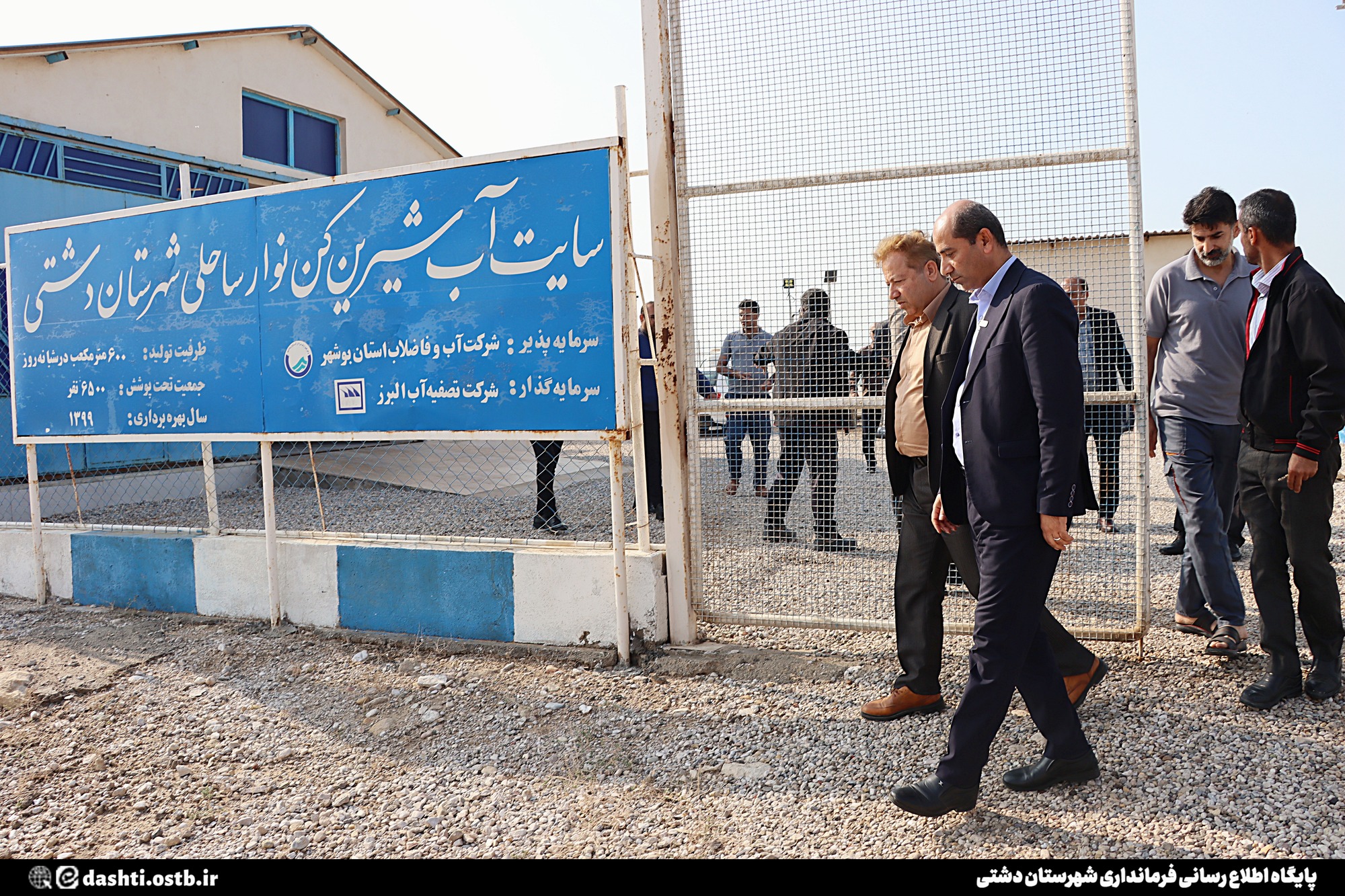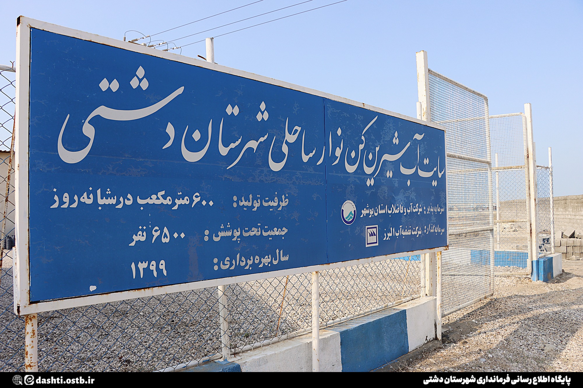 فرماندار دشتی از ارتقای ظرفیت آب‌شیرین‌کن نوار ساحلی شهرستان به ۱۶۰۰ مترمکعب خبر داد و گفت: این اقدام در راستای بهبود تأمین آب شرب پایدار، افزایش تاب‌آوری روستاهای ساحلی و پاسخ به نیازهای جمعیتی و توسعه‌ای منطقه در دستور کار قرار گرفته است.