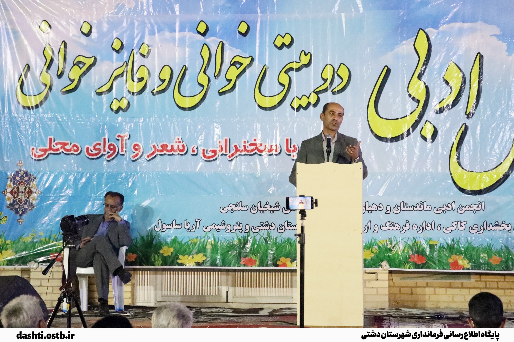 رضا مقاتلی در همایش ادبی دوبیتی‌خوانی و فایزخوانی در روستای شیخیان سلنجی ضمن تبریک نوروز و عید سعید فطر، از جایگاه ویژه فرهنگ و هنر در شهرستان دشتی سخن گفت و بر لزوم استفاده بهینه از ظرفیت‌های فرهنگی منطقه در جهت معرفی مناسب شهرستان و حرکت پرشتاب به سمت توسعه تأکید کرد.