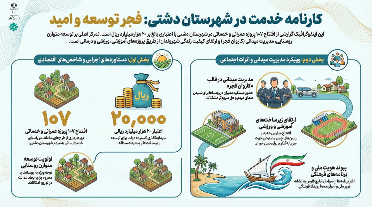 اینفوگرافیک| کارنامه خدمت در شهرستان دشتی؛فجر توسعه و امید